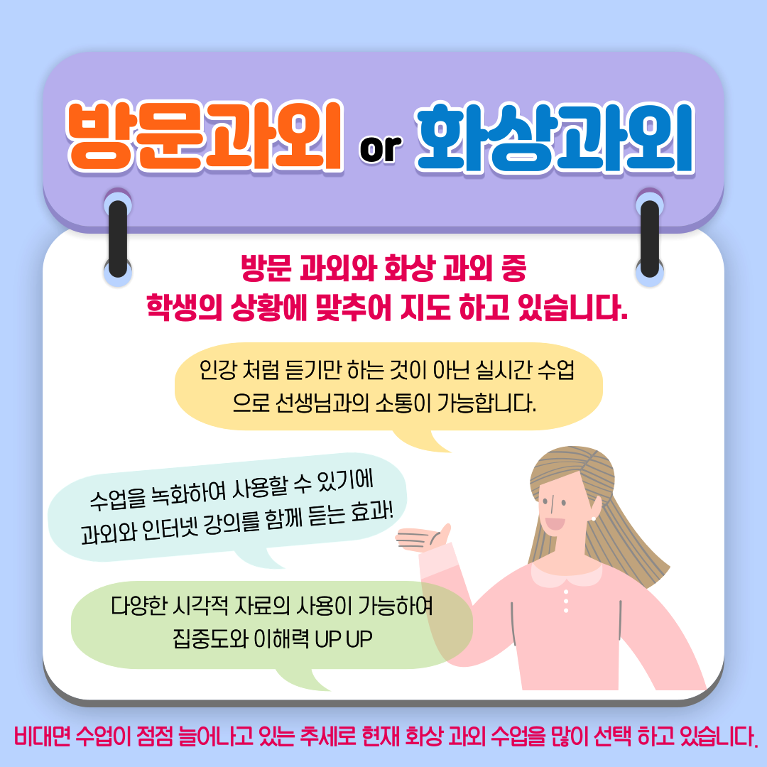 학부모 입장에서 과외를 고민할 때 가장 중요하게 본 건 아이가 주도적으로 공부하게 만들 수 있는가였다. 단순히 정답만 알려주는 과외라면 의미가 없다고 생각했다. 이번에 경험한 과외는 방향을 잡아주고 스스로 생각하는 힘을 길러주는 수업이었다. 시험 점수는 그 결과로 자연스럽게 따라왔다. 개인별로 약한 부분이 다르기 때문에 맞춤형 과외가 큰 힘이 된다는 걸 다시 한 번 느꼈다.